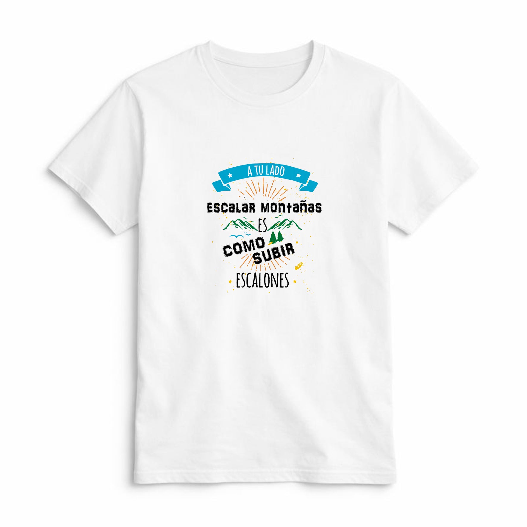 Esta camiseta con frase romántica es un detalle original y especial para sorprender a alguien que te inspira a seguir adelante. Su diseño con montañas y el mensaje “A tu lado escalar montañas es como subir escalones” la convierten en un regalo original para enamorados lleno de significado.
