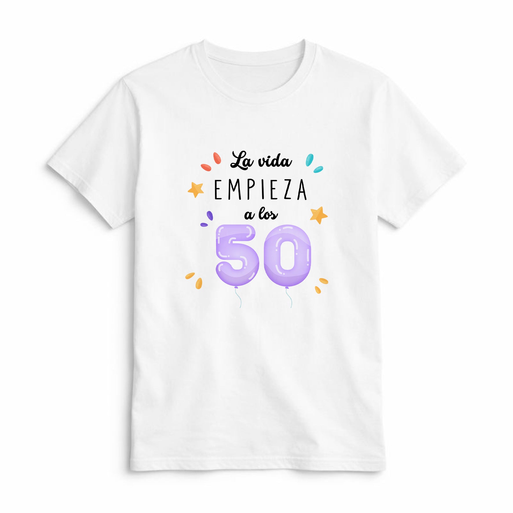 Esta camiseta de cumpleaños de 50 años es perfecta para celebrar una nueva etapa con alegría, humor y estilo. Su diseño con la frase “La vida empieza a los 50” y números en forma de globos la convierte en un regalo original para 50 cumpleaños ideal para sorprender en una fecha tan especial.