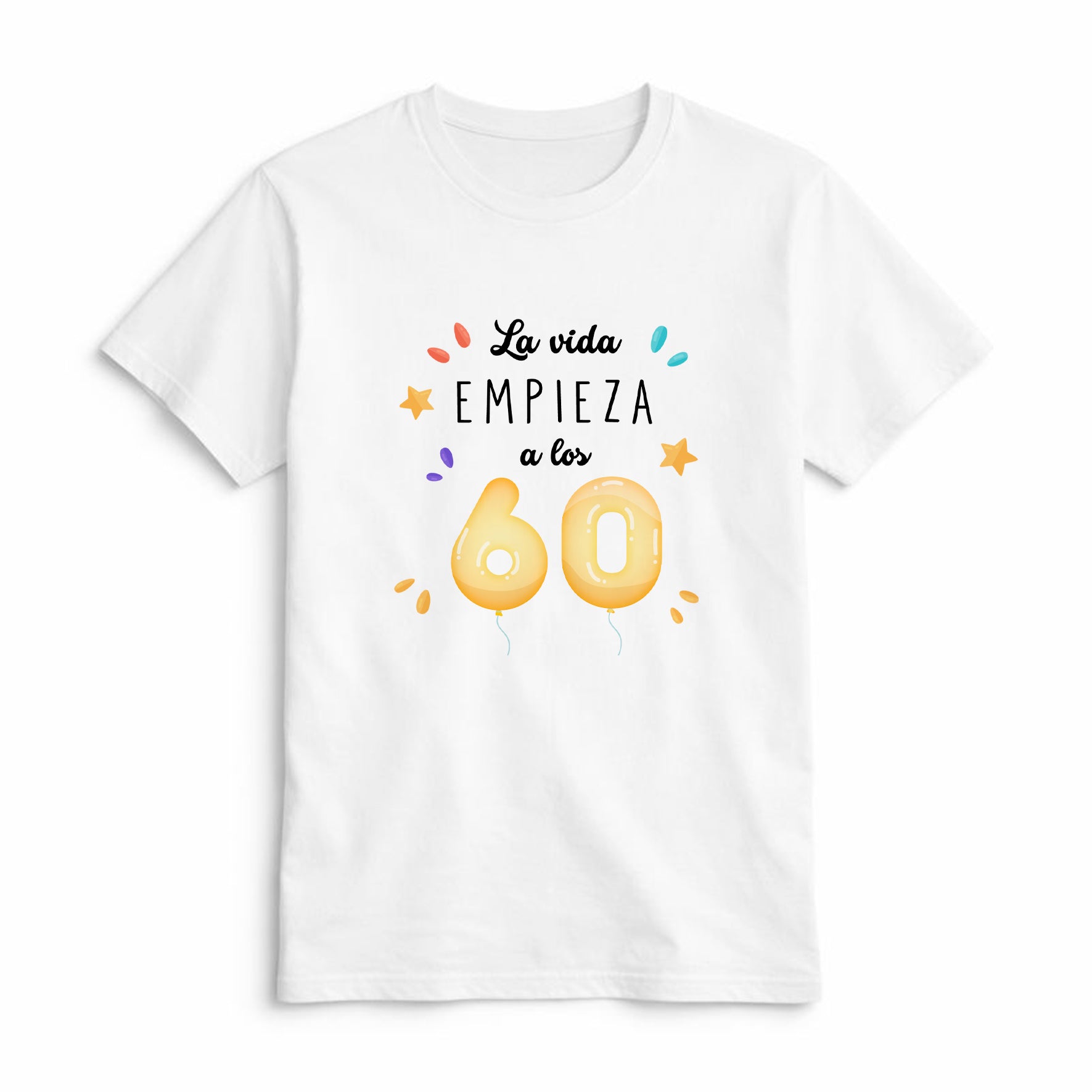 Esta camiseta de cumpleaños de 60 años es perfecta para celebrar una nueva etapa con alegría, humor y estilo. Su diseño con la frase “La vida empieza a los 60” y números en forma de globos la convierte en un regalo original para 60 cumpleaños ideal para sorprender en una fecha tan especial.