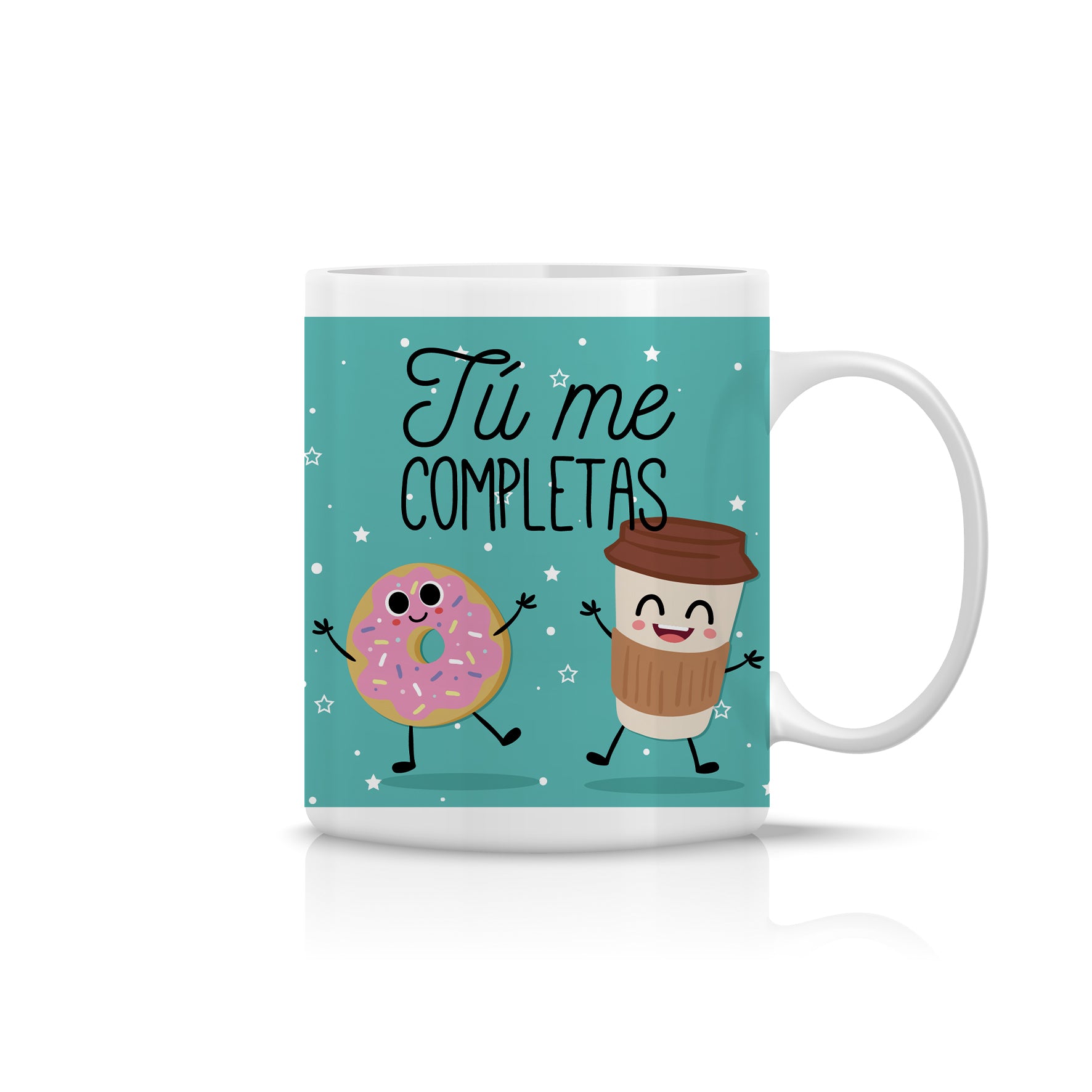 Una taza para enamorados con un diseño divertido, tierno y muy original, perfecta para parejas que se complementan a la perfección. La frase “Tú me completas” junto a la ilustración de un café y un donut la convierte en un detalle especial, simpático y lleno de cariño.