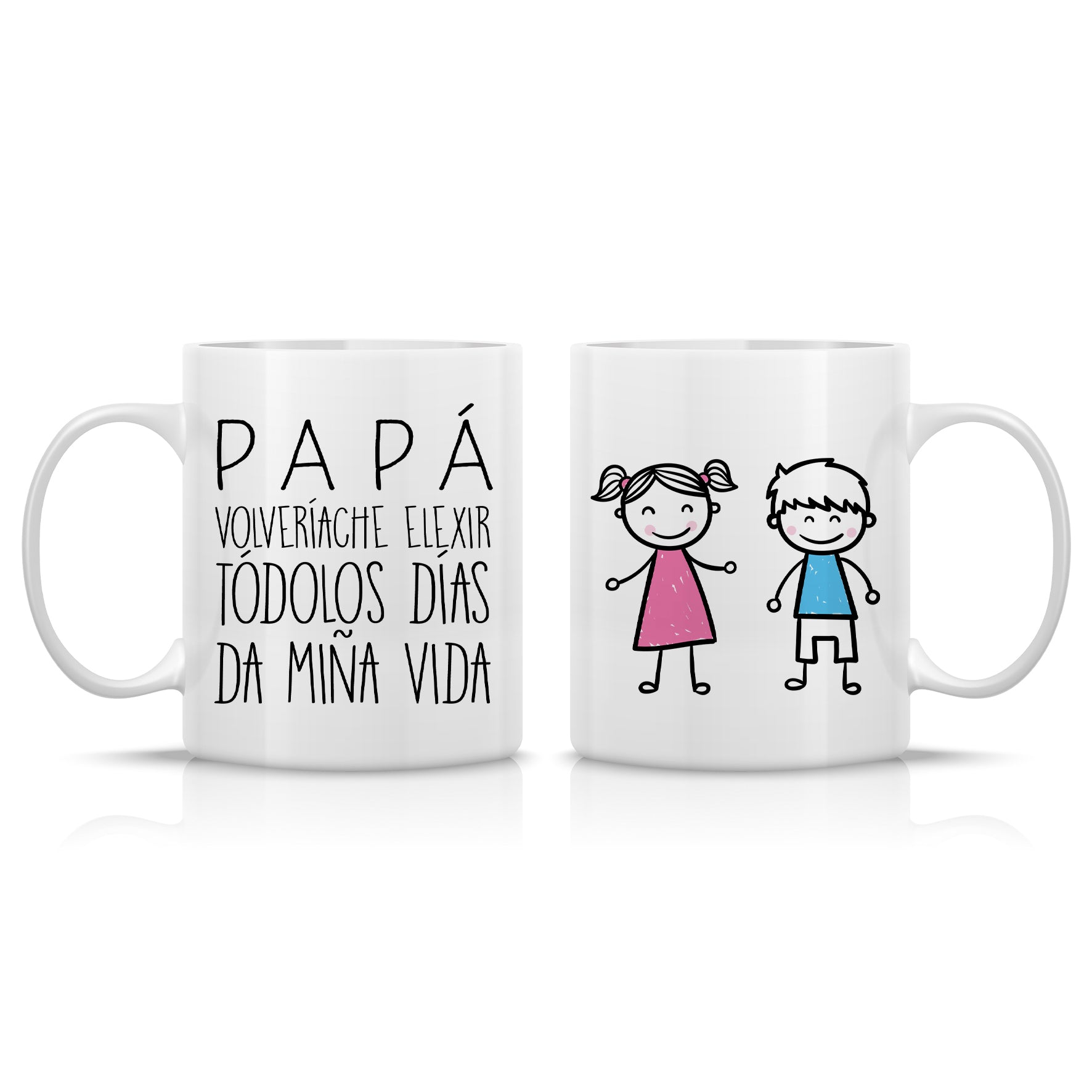 Si estás buscando tazas originales para padres con un mensaje que emocione, esta es de las que llegan. La frase en gallego “Papá, volveríache elixir todos los días da miña vida” es sencilla, bonita y muy directa: un “te elegiría siempre” para recordarle cada mañana lo importante que es.
