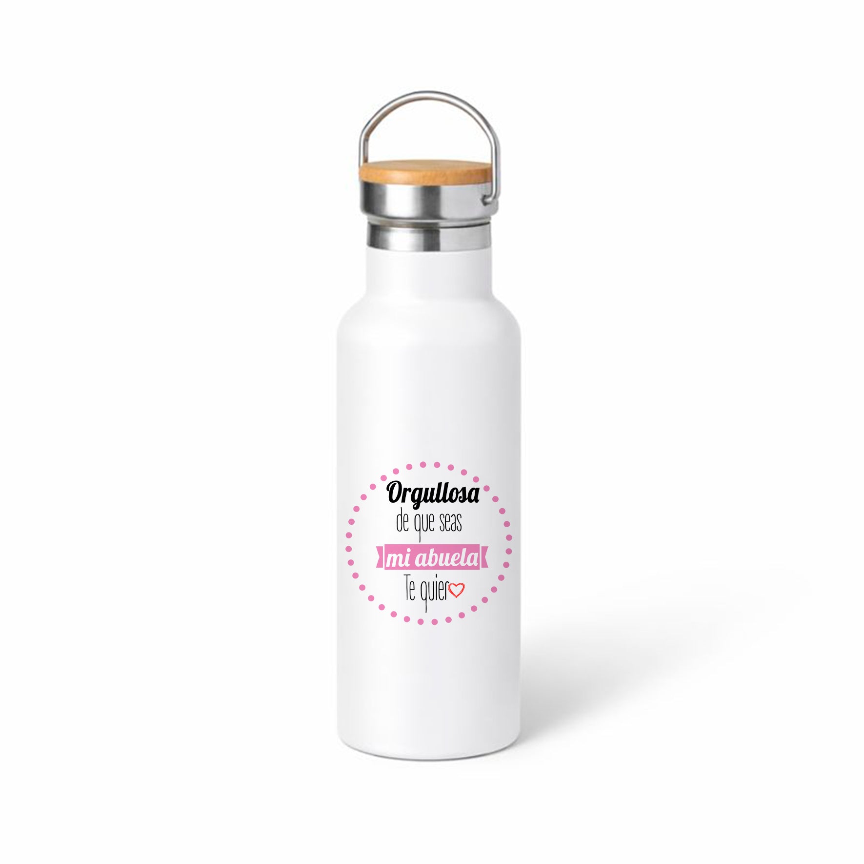 Un termo sencillo, bonito y muy directo al corazón. El diseño en tonos rosas con la frase “Orgullosa de que seas mi abuela” (y el “te quiero” con corazón) es perfecto para regalar cuando quieres emocionar sin complicarte: un detalle que se usa cada día y que siempre recuerda lo importante que es.