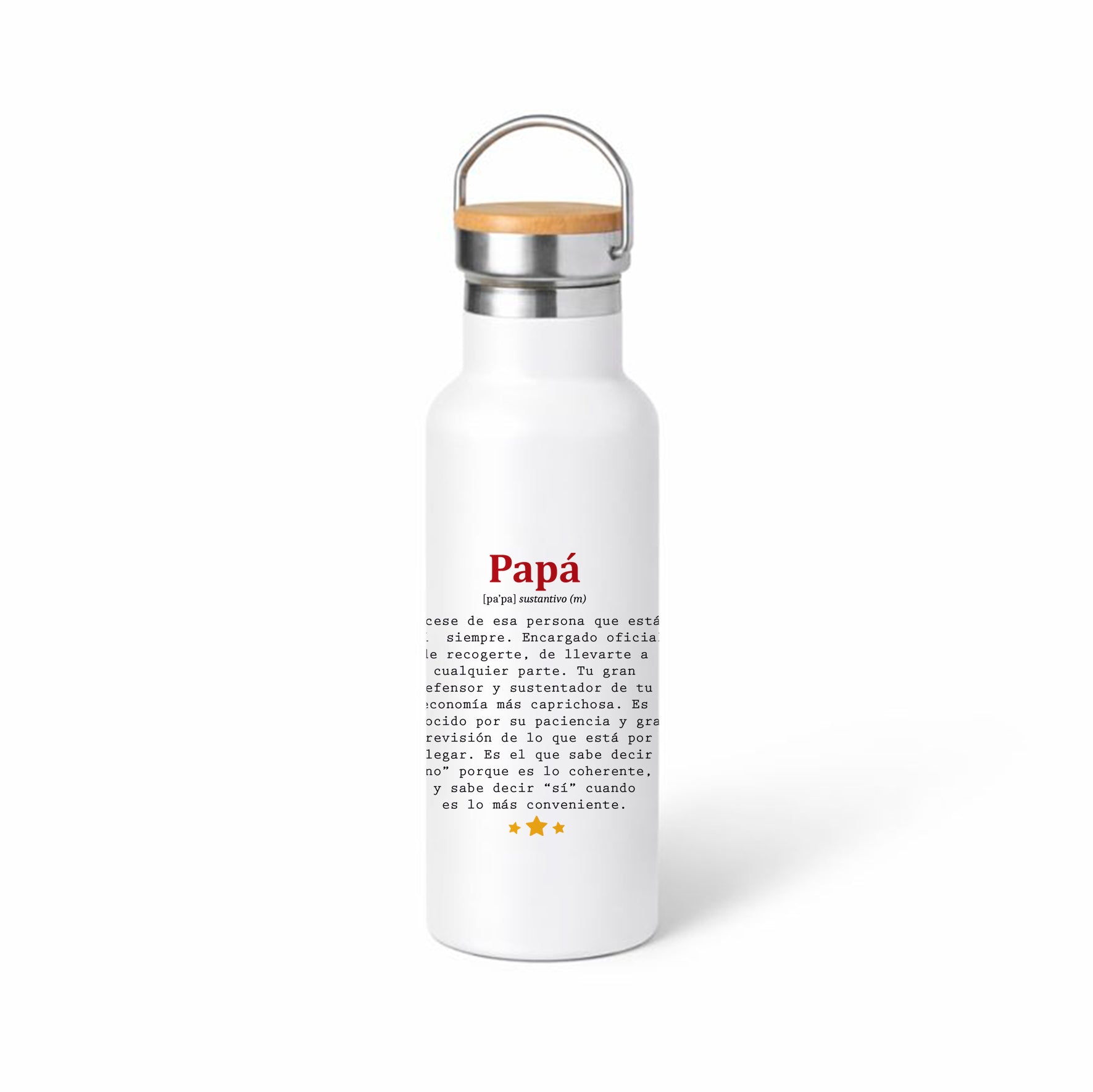 Un diseño con personalidad, original y muy fácil de acertar. Este termo para papá presenta una definición tipo diccionario dedicada a esa figura imprescindible que siempre está ahí: el que cuida, ayuda, acompaña y aparece justo cuando hace falta.