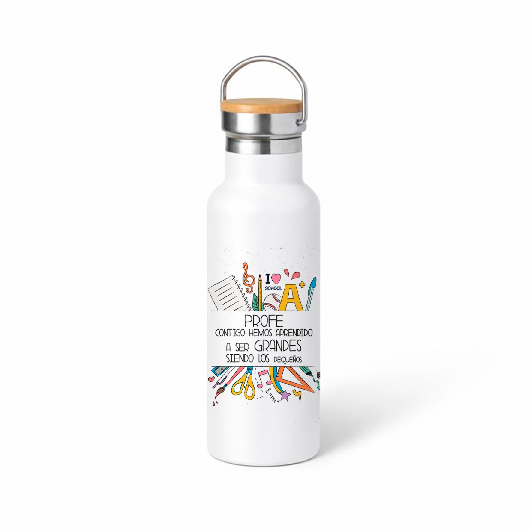 Un termo de agradecimiento bonito y con mensaje profundo. Con ilustraciones de material escolar y la frase “Profe, contigo hemos aprendido a ser grandes siendo los pequeños”, es un regalo perfecto para fin de curso, graduación o como detalle de la clase. Emociona, es útil y queda genial como recuerdo.